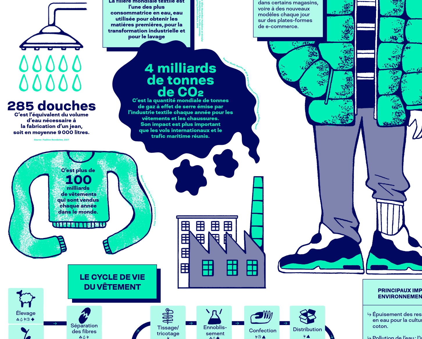 - Chaque année, ce sont 240 000 tonnes de microfibres plastiques qui sont relâchées dans les océans du monde entier en raison de la production, de l’entretien, puis de la fin de vie de nos vêtements synthétiques (source : ADEME);